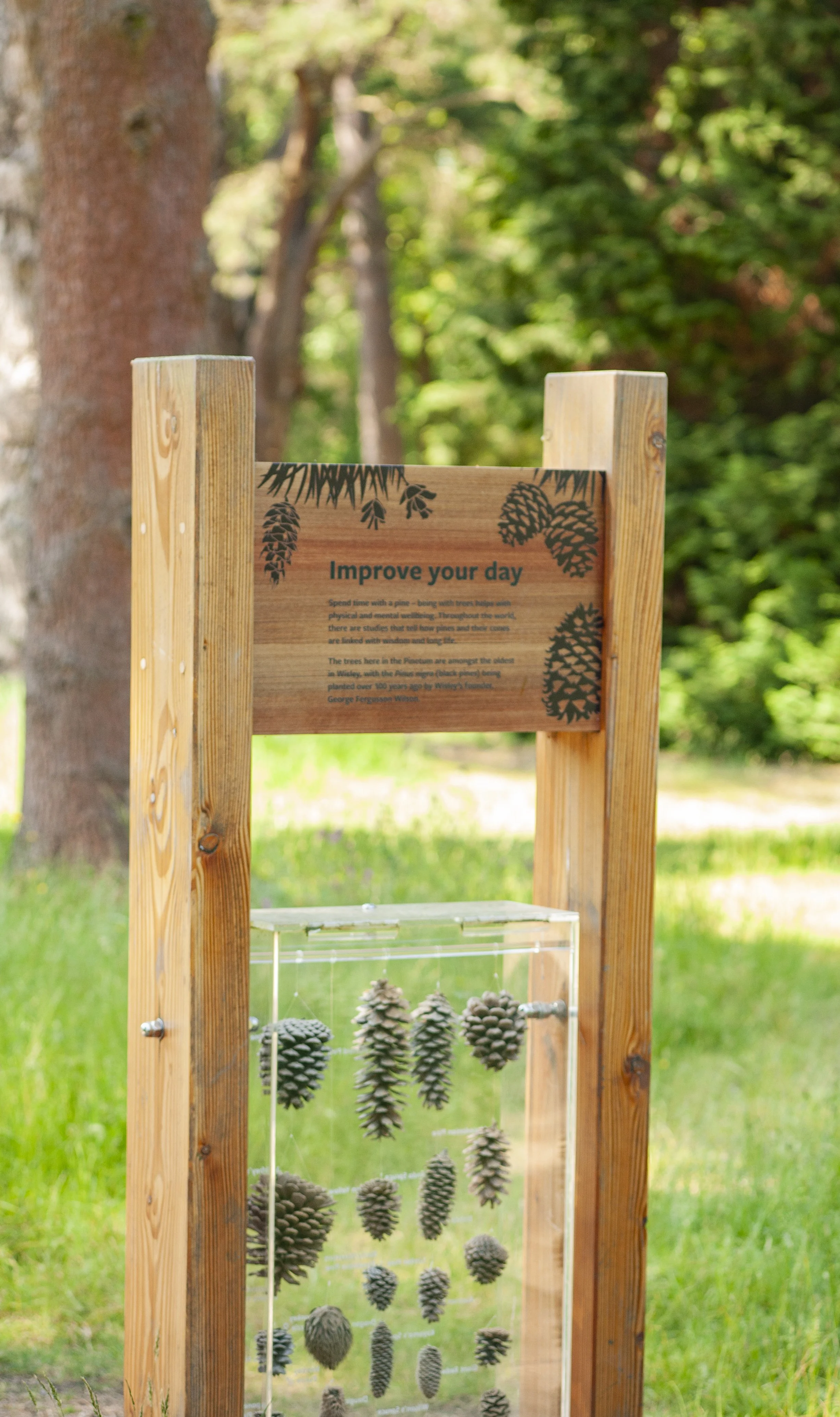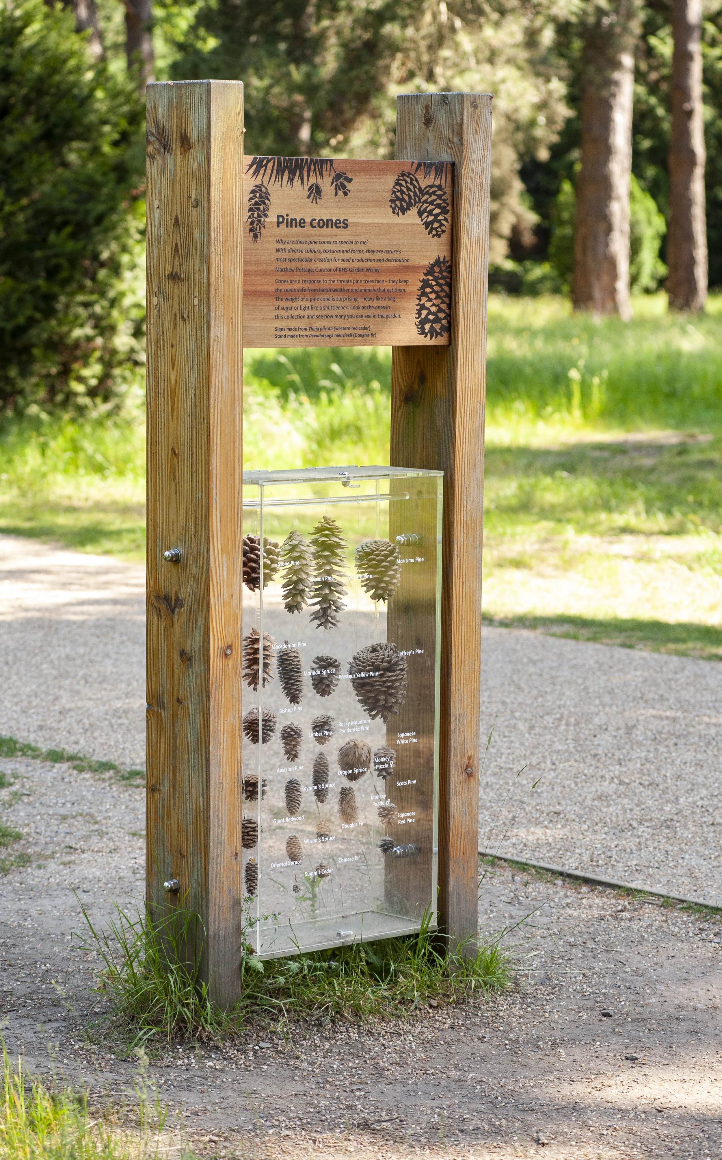 Designed to stand proud in the Pinetum of RHS Garden Wisley, this was built in 2018 to showcase the variety of different pine cones you might find as you stroll through the Pinetum. Made from Douglas Fir and Western Red Cedar wood (reflecting the pine trees surrounding it), the laser engraved wood reflects the materials its made from as it features bespoke illustrations of both pines cones from the Douglas Fir and Western Red Cedar. The acrylic box encasing the cones was built to not only protect the cones from little fingers, but also as a way of labelling the cones for the visitors to compare size, scale and shape to find on their walk, using reverse cut vinyl lettering. The laser engraved panels were replaced in 2023 with printed wooden panels.